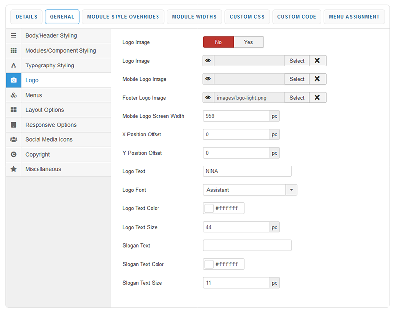 This section of the template parameters allows full control over your site logo with an array of easy to use options. Upload your logo image via the 'Select Logo Image' field and then use the X and Y axis field to tweak its position.